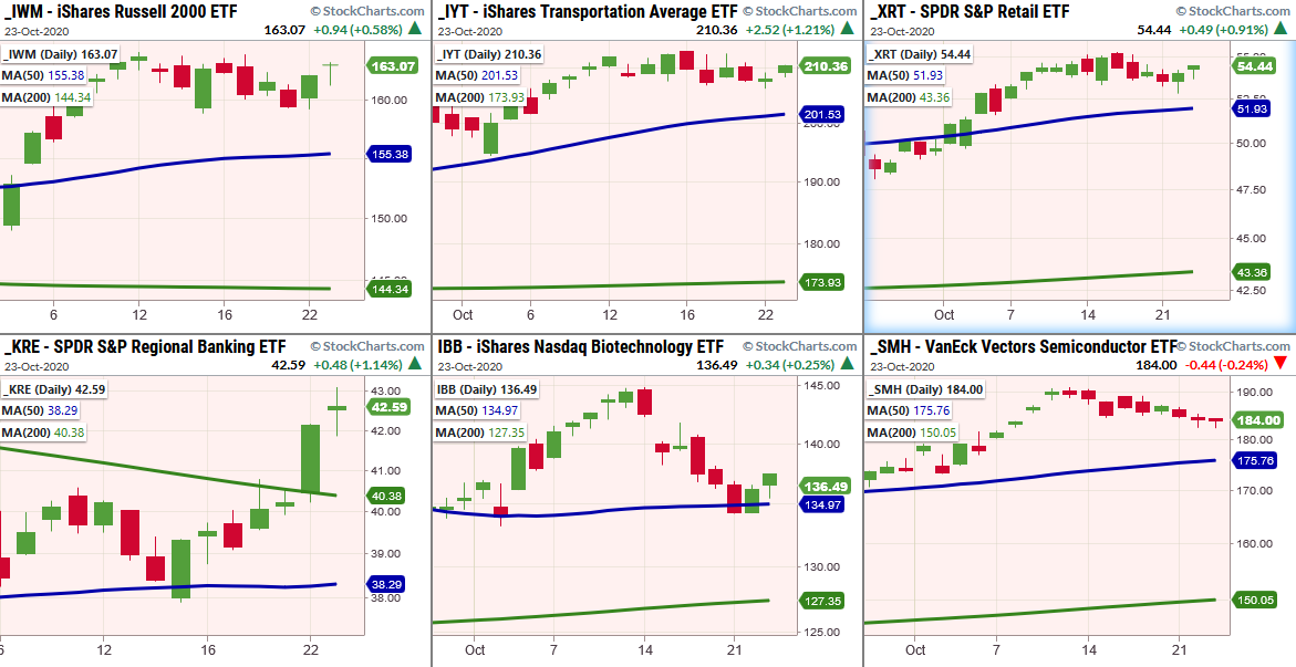 Going to the daily charts we can see that Grandad IWM, Transportation IYT, and Granny Retail XRT, are digesting their price ranges.