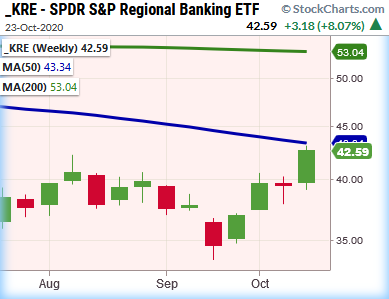 Going to the Modern Family, we can see that the regional banking sector (KRE ETF) has made the largest gain of over 7% since Monday.