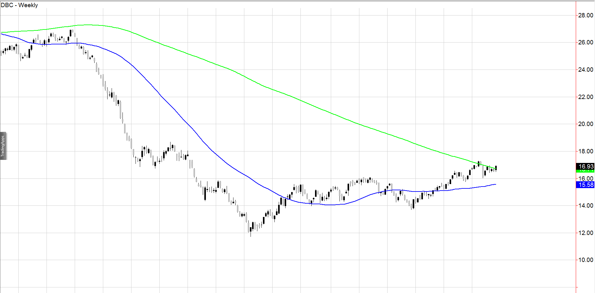 Here is a chart of the DB Commodity Tracking Index ETF DBC. The green line is the 200-week moving average.