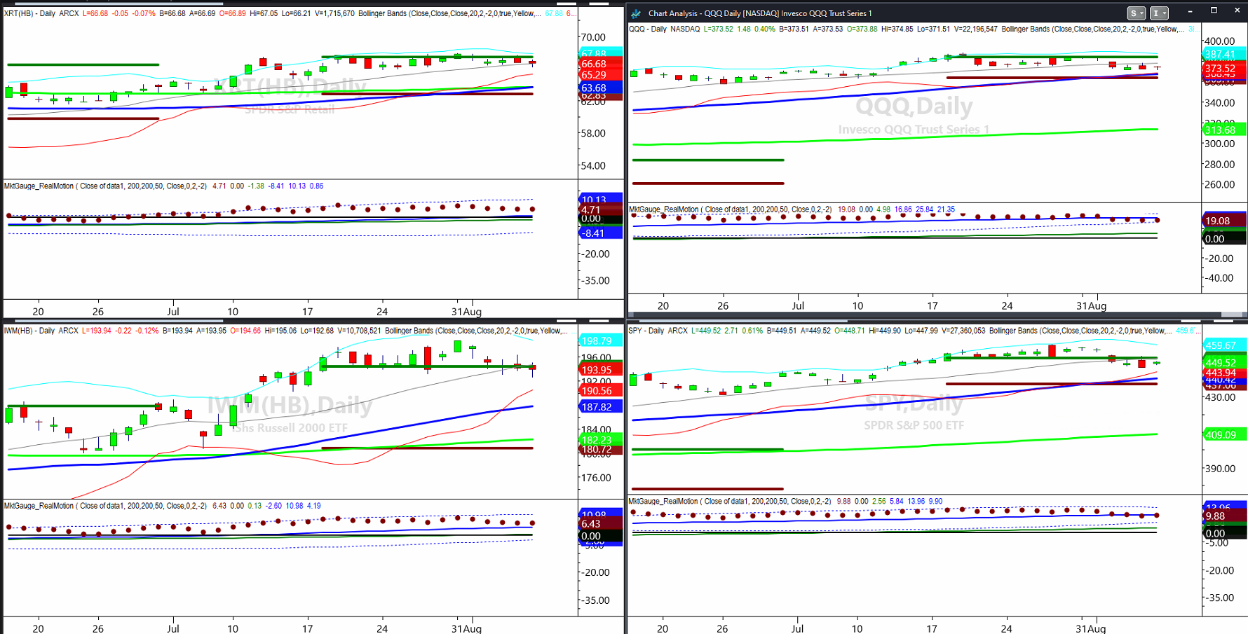 As for SPY, although it is in a bit of a better chart position than the QQQs, it too sits below the July range high with momentum on its 50-DMA.