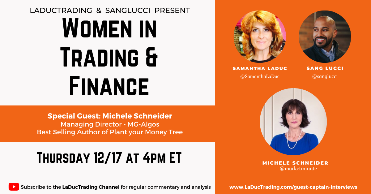 Please join Mish, Samantha LaDuc and Sang Lucci at 4PM ET Thursday December 17th for a discussion on women and trading-sharing stories, the ups and the downs -plus what has changed in the last 2 years.