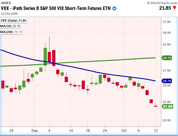The (VXX) short term volatility, which is used as a fear indicator in the market broke down last week as the market rallied.