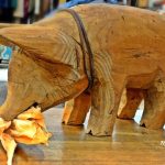 This wooden pig is eating corn.