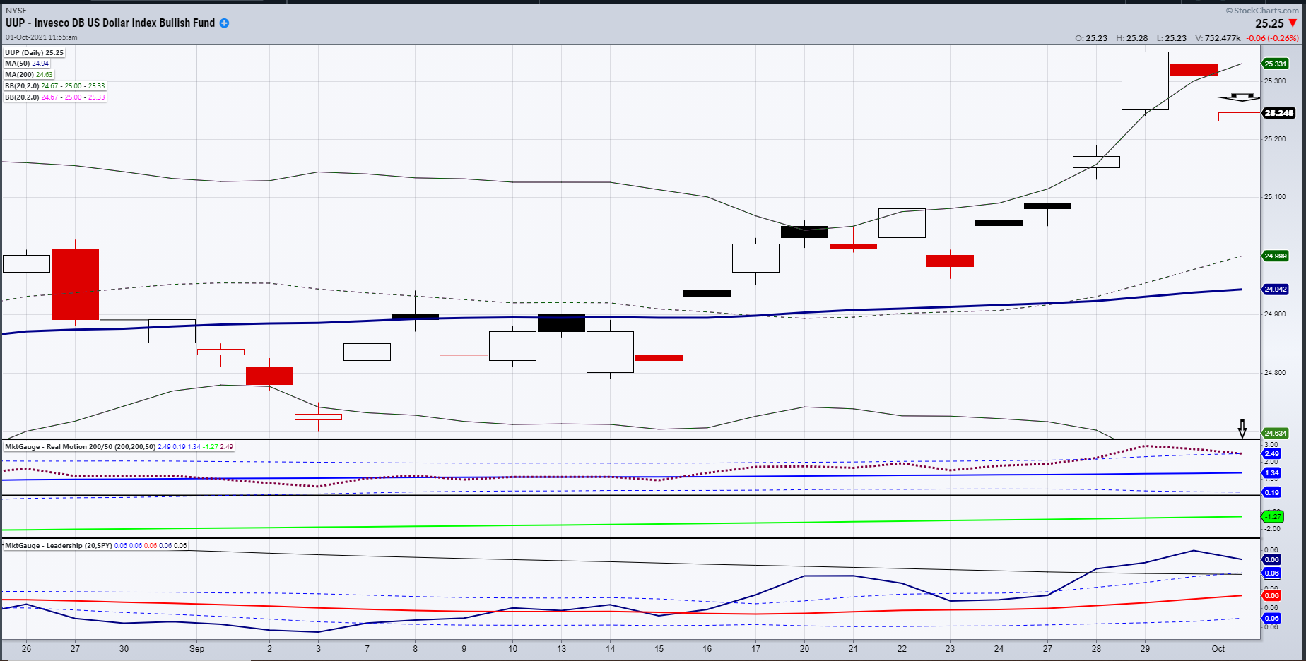 The U.S Dollar chart as represented by UUP, the Invesco DB US Dollar ETF, shows some classic signs of a top.