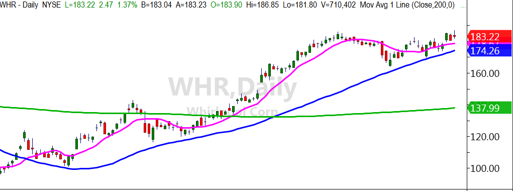 Another one to watch is WHR, Whirlpool Corp. This Home Appliance company is also sitting in a strong trend while holding its recent dips to the 50-DMA very well.