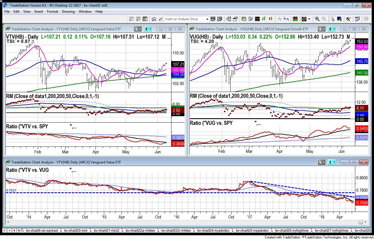 It shows the current prices of the Growth (VUG) and Value (VTV) ETFs. On the bottom is the ratio (as of Monday’s close) between the two.
