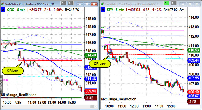 Below you’ll see the intraday charts of the SPY and QQQ with the Opening Range levels marked by the red and green horizontal lines.