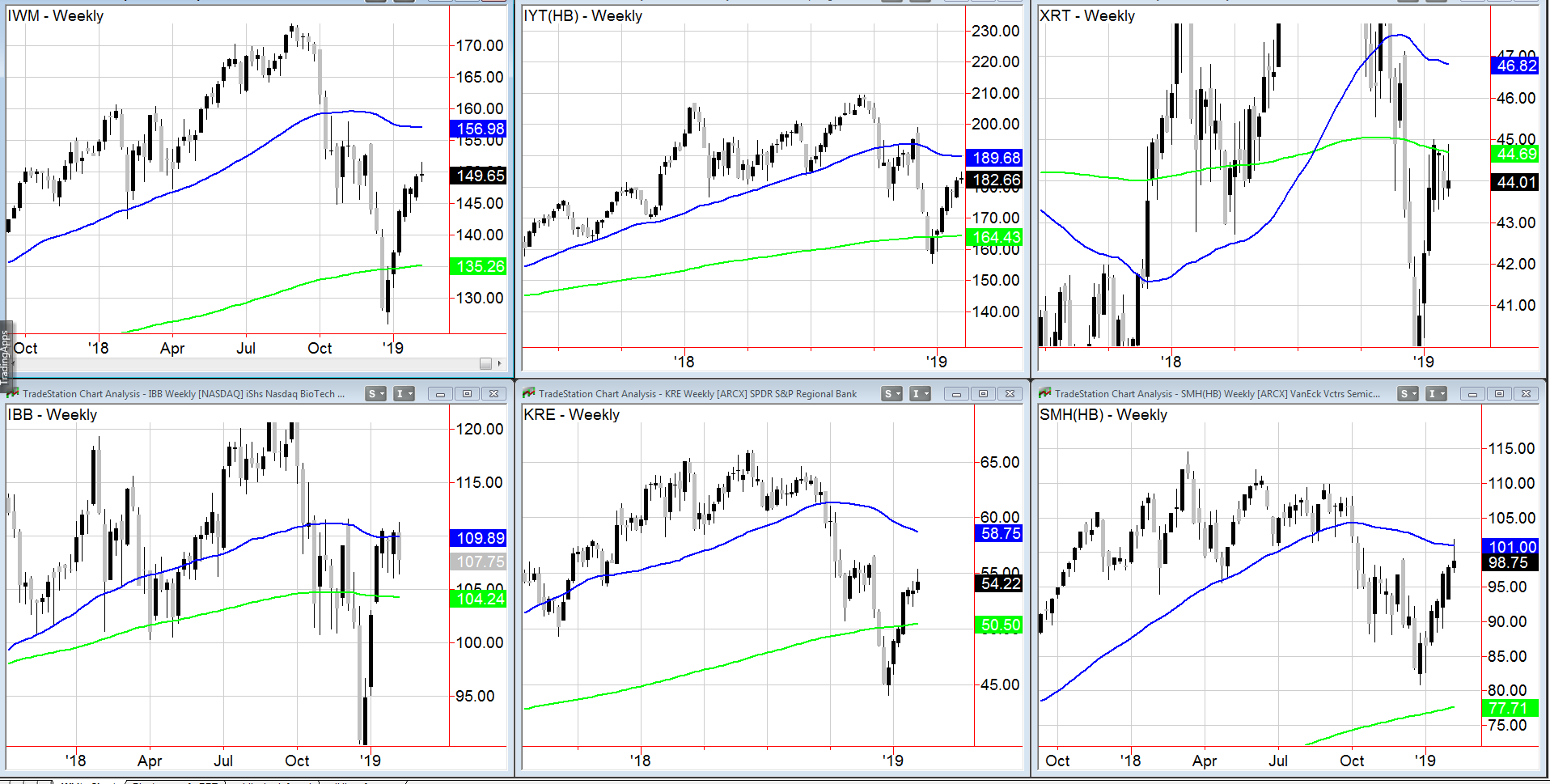 From left to right-Sister Semiconductors (SMH), Prodigal Son Regional Banks (KRE), Granddad Russell 2000 (IWM), Granny Retail (XRT), Tran Transportation IYT, and Big Brother Biotechnology (IBB).
