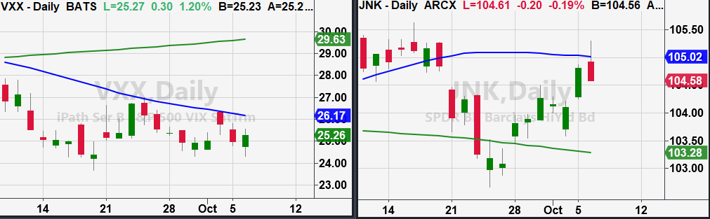 JNK shows investors appetite for high yield corporate debt, while the VXX shows short term volatility representing fear in the market.