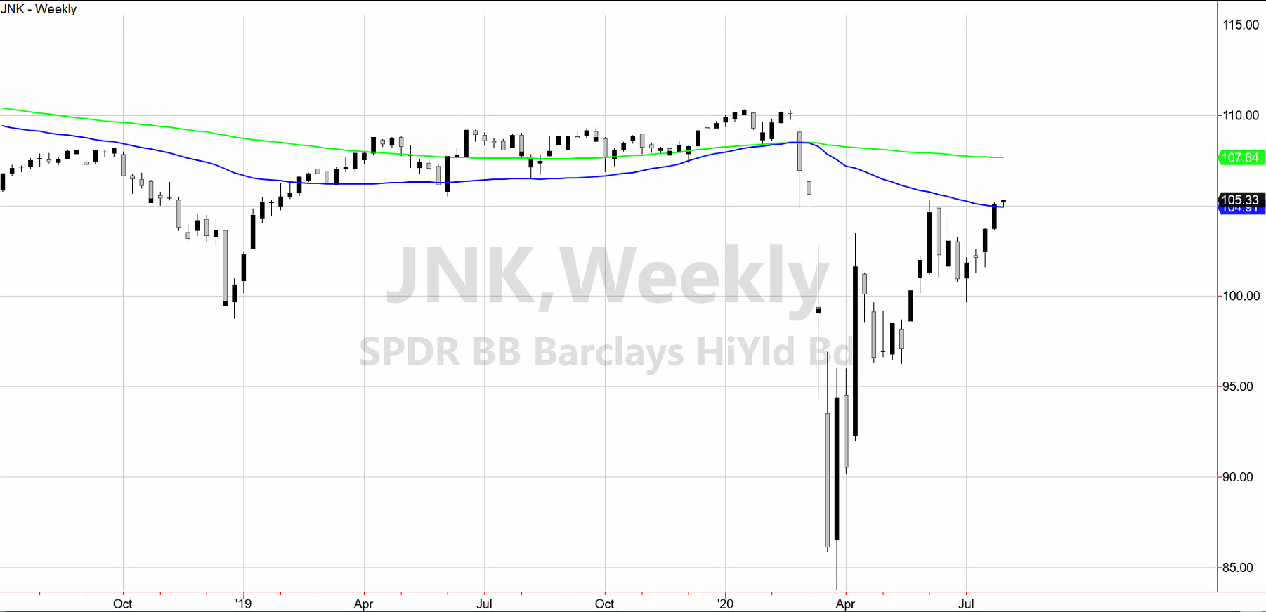 The weekly chart of JNK shows it cleared the 50-week moving average (blue).