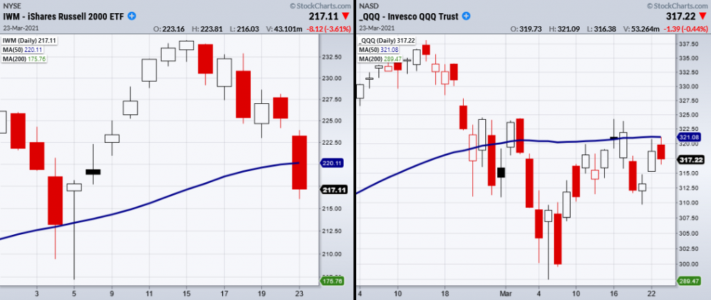 On the other hand, Russell 2000 (IWM) broke under the 50-DMA.