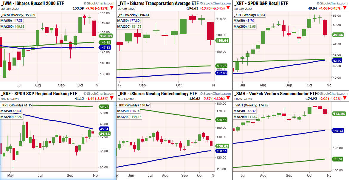 The Family consists of the Russell 2000 (IWM), Transportation (IYT), Retail (XRT), Regional Banking (KRE), Biotechnology (IBB), and Semiconductors (SMH).