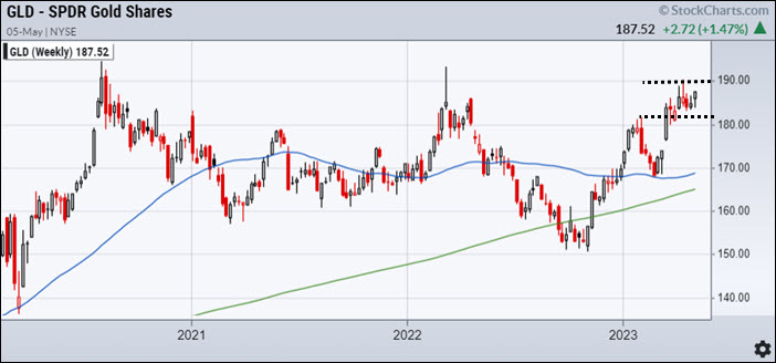 Tomorrow, the Fed will likely raise rates again, which is expected. However, if Chairman Powel’s remarks create a further loss of confidence in the Fed’s ability to navigate the worsening banking crisis, economy, and inflation risks, the weekly gold chart (below) is ready to shine.