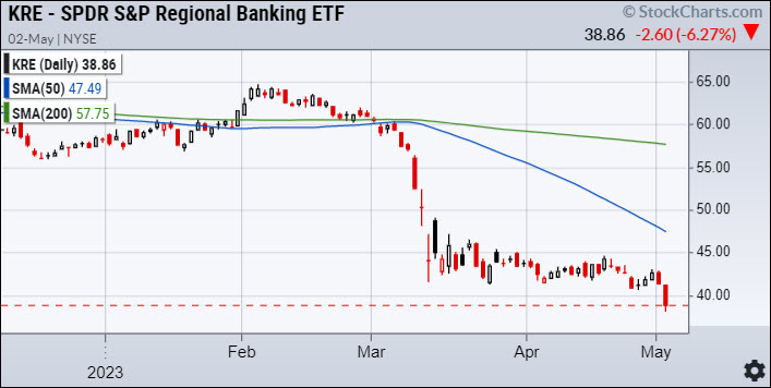 Today the market’s mood with respect to the regional banking system went from bad to worse, as exemplified by the action in the KRE and the XLF.
