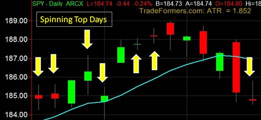 These can be especially difficult days to daytrade as there is little follow-thru from breakouts. And for position trading, when they occur in potential key inflection areas on charts, they can signal an end to a trend, or at least a momentary cease-fire in the market’s movement.