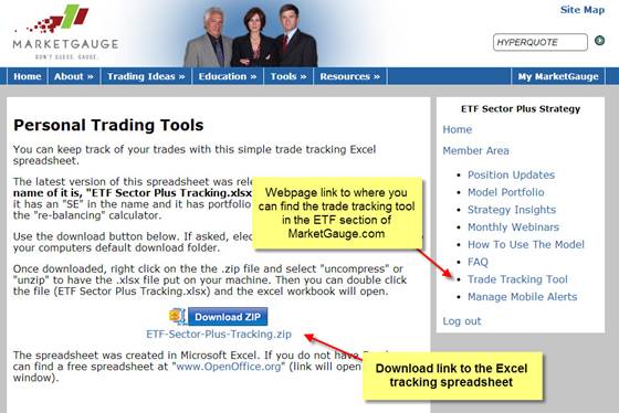 The Trade Tracking tool can be downloaded from the marketgauge.com website once you log into the ETF Sector Plus section. It is a Microsoft Excel file. We have a similar version for Open Office, a free spreadsheet program.