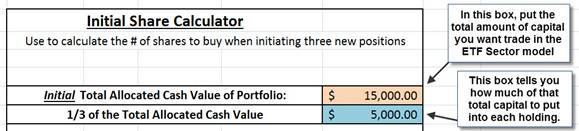 The first step for this calculator is to put in the tan box above the amount of capital you are going to use to trade the ETF Sector Plus model. The blue output box merely divides that number into thirds, giving you how much cash value to buy of each of three ETFs.