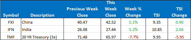 This week there were no position changes in the ETF Country Plus model. IFN reached its first profit target Friday and the stops and targets model took off 1/3rd of that position. Our current three positions are FXI, TMF, and IFN. For those trading the “Stops & Targets,” TMF is only 1/3rd of a position and IFN is 2/3rds of a position.