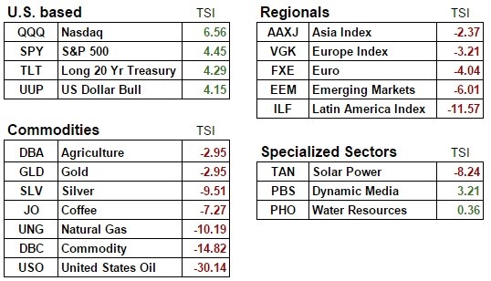The hard truth of it is there are very few bright spots in the world. The chart above colorizes the countries with ETFs we monitor based on their TSI score (higher positive TSI scores marked in brighter green colors and lower negative TSI scores in darker red colors).