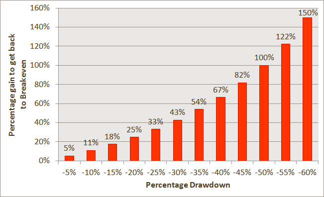 A 20% decline requires you to make 25% the next period to get back to even and a 50% decline requires a whopping 100% gain just to claw back to even. This is one reason the severe declines in the financial crises of 2008-2009 took so long to recover from (if you were fortunate enough to ride it back up from the bottom).