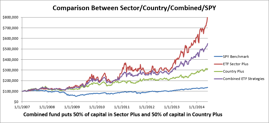 We can take advantage of these differences by creating a hybrid system that trades both strategies, putting 50% of the capital into the three sector holdings and 50% of the capital into the three country holdings.
