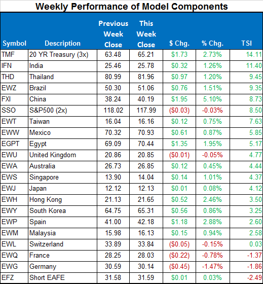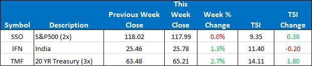 For the country model, we are in SSO, IFN, and TMF. TMF, the leveraged treasuries, reached its first target on Monday and continued to new recent highs. SSO has basically been flat the last two weeks and has retreated to 6th place in our model, but remains fairly close in TSI rank.