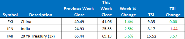 This week there were no position changes in the ETF Country Plus model. Our current three positions are FXI, TMF, and IFN. For those trading the “Stops & Targets,” TMF is only 2/3rd’s of a position.
