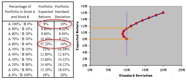 While this is still a very limited set of possibilities (remember we only have two holdings), we stumble upon a unique finding! At the 10% standard deviation level (holding risk constant), we can actually choose whether or not we want to get an 8% return or an 11.2% return simply by changing how much of our portfolio is in each. We can get a higher return with the same amount of risk (volatility) because we added some diversification. This is what’s known in the industry as a “free lunch.”