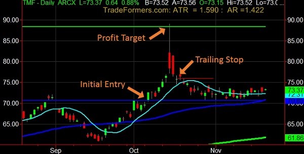 In just the sector model, we had examples of both recently. With the selloff in October, treasures started to really gain momentum. We got into a TMF trade and eight days later it surged briefly to our first target. We took some profits near the highs and were stopped out on the rest at a profitable trailing stop that is still above the recent price action.
