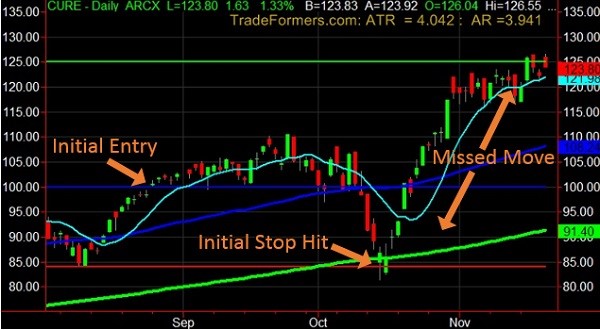 However, we also had an unfortunate situation in a CURE trade where it went down just low enough to hit our stop, locking us out of a quick recovery and an eventual profit target.