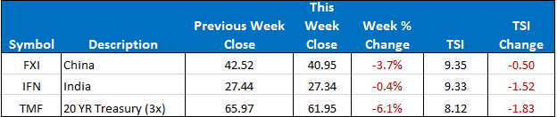 This week there were no position changes in the ETF Country Plus model. IFN reached its first profit target last Friday and the stops and targets model took off 1/3rd of that position. Our current three positions are FXI, TMF, and IFN. For those trading the “Stops & Targets,” TMF is only 1/3rd of a position and IFN is 2/3rds of a position. The Stops and Targets model had a smaller selloff this week due to holding a significantly smaller position in TMF.