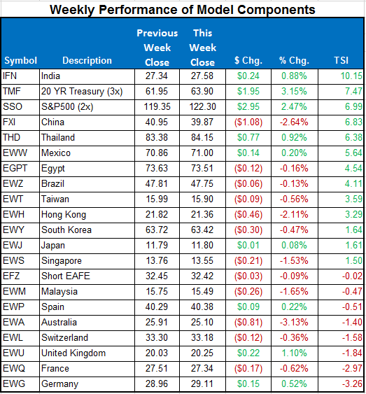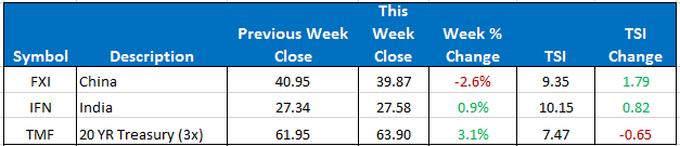 For the country model, we are in FXI, IFN, and TMF. TMF was stopped out in the stop & targets model but it remains a position in the basic model and bounced off its lows Friday. FXI has fallen to fourth place with SSO and THD swapping places with similar TSI scores.