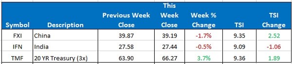 This week there were no position changes in the ETF Country Plus model. Our current three positions are FXI, TMF, and IFN. The stops and targets model was stopped out of TMF and will remain in cash until the model generates a fresh entry.