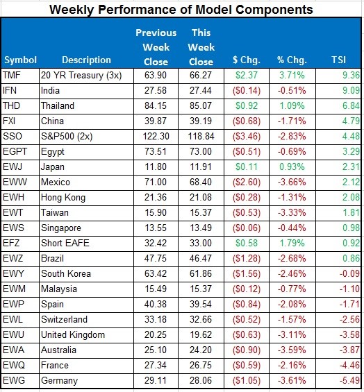 For the country model, we are in FXI, IFN, and TMF. TMF was stopped out in the stop & targets model but it remains a position in the basic model and made a nice comeback this last week end on the highs for the week. FXI remains in fourth place and the gap between THD and FXI widened. We should expect a change should they diverge further in the next couple trading days.