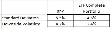 Comparing the standard deviation and downside volatility for both the SPY and the ETF Complete Portfolio, we can see that the ETF Complete Portfolio had a smaller percentage of its volatility from negative returns than the SPY by a fair amount.