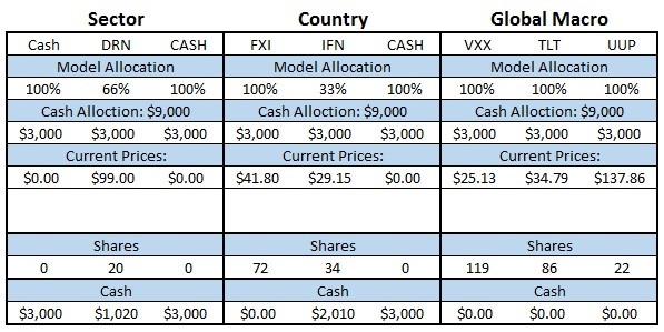 For ease of illustration, I have assumed you have $9,000 allocated to each model ($27,000 total). The “Cash Allocation” lines show the total allocation for each model and that translates to $3,000 for each position in each model.
