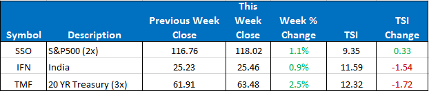This week we made no position changes in the ETF Country model. Our current three positions are SSO, TMF, and IFN. For those trading the “Stops & Targets” mode, TMF is near its first target. To open next week, we will remain in those three ETFs.