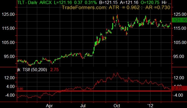 You can see this in the chart above. From July through October 2011 the treasuries made a big move and you can see the TSI score (red line in the sub graph) chasing it up. But from October 2011 to March 2012 the treasuries were basically chopping sideways and the TSI score is slowly depreciating back to zero.