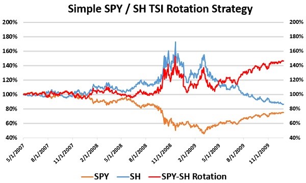 There are potentially a lot of other uses for the TSI. If you just looked at comparing two different ETFs, SPY and SH (non-leveraged short SPY ETF) and used a simple rule that you would hold the SPY when its TSI was greater than SH or rotate into SH when it had a higher TSI score you could have completely avoided the draw 50%+ drawdown from the financial crises of 2008.