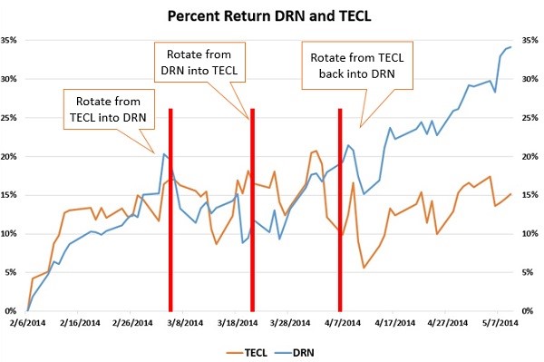 The chart above is the percent change performance of the two ETFs. During the March chop we ended up closing out of those trades with small losses in the neighborhood of 6%. But when DRN broke out of the congestion, we were in it and we went on to hold onto that trade for the next four months and saw it reach a 25% profit target.