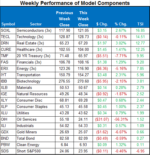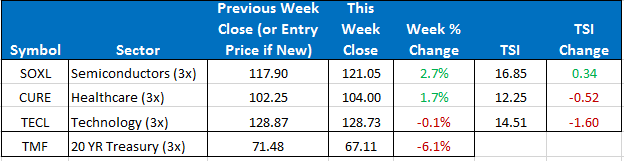 For the Sector model, we are in SOXL, TECL, and CURE. The TMF trade did not pan out as U.S. Treasuries sold off their highs. We closed out of that position near a 6% loss on that third of the portfolio. CURE wasn’t looking that great Friday morning on the open but any purchase in the first hour would have netted you a nice once day percentage gain in that position. No position changes are imminent but stay tuned to the daily updates should any position change.