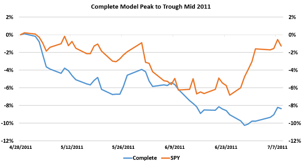 Coming into the April 29th high, the Complete model was up 12.5% for the year while the SPY was up around 8%. The model was exclusively postured long with some cash from profit taking. Over the next few months, the markets would deteriorate as concern about European debt levels grew to a fever pitch and a fiscal standoff in Congress ended with the S&P downgrading U.S. government debt.