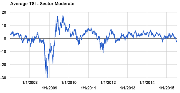 The chart above tracks the average TSI score of the investible universe (18 ETFs) of the Sector Conservative/Moderate model. You have to go back to 2011 to see a period where we spent significant time below the zero line. (Not entirely coincidentally, the 2010 and 2011 corrections were also related to Greek and European debt issues, among other things).