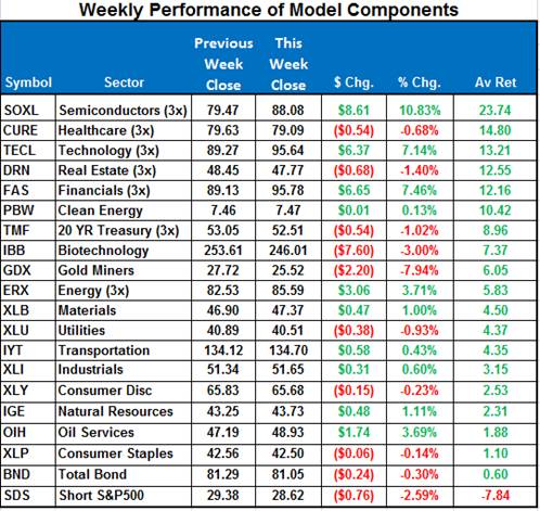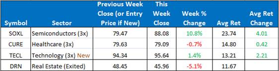 This week there was one change in the model portfolio. We sold out of DRN on Thursday morning and entered into TECL.