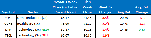 This week we issued one change in the model. On Monday morning, we sold out of TECL and bought DRN at the open. To open next week, we will be in SOXL, CURE, and DRN but changes in our portfolio could be afoot.