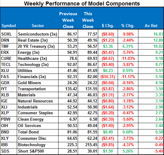 The ETF Sector Plus Model took its fair share of punishment from the downdrafts in the market. We had already lowered our beta exposure by transitioning into DRN, but SOXL (semiconductors) and CURE (healthcare) had severe selloffs in the later half of the week.