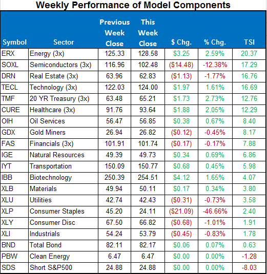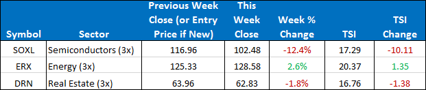 This week there were no position changes in the Sector Plus model. DRN hit a profit target in the “Stops & Targets” model last Friday. Our current three positions are SOXL, ERX, and DRN. To open next week, we will remain in those three ETFs.