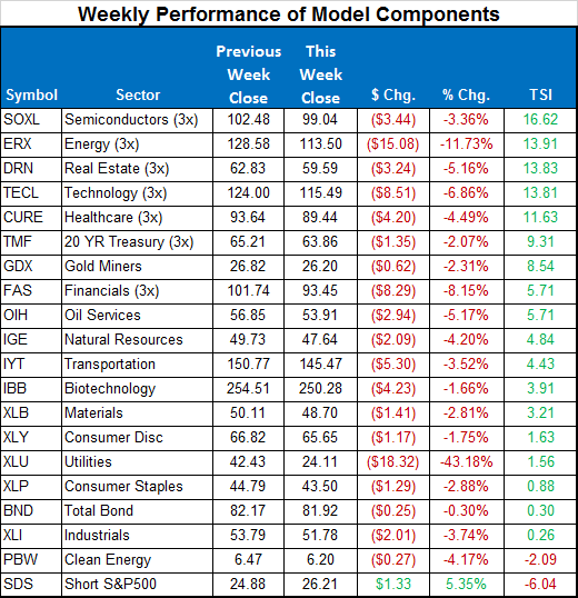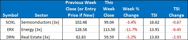 This week there were no position changes in the Sector Plus model. Our three positions are SOXL, ERX, and DRN. To open next week, the “basic” model will remain in those three ETFs. In the “Stops & Targets” model we are already out of SOXL and only have 2/3rds positions in ERX and DRN. Accordingly, the selloff this week was considerably less in the Stops & Targets model.