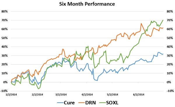 For now, we are going to assume that you purchased three equal dollar positions of CURE, DRN, and SOXL on January 2nd, 2014 and held them until July 1st 2014.