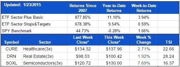 The ETF Sector models, while going on a volatile ride this week, continue to crush the SPY benchmark on the week and on the year. The Stops and Targets lagged a little more this week, only being in one position. However that position, DRN, did reach its first profit target and the model sold 1/3rd of the position on Tuesday.